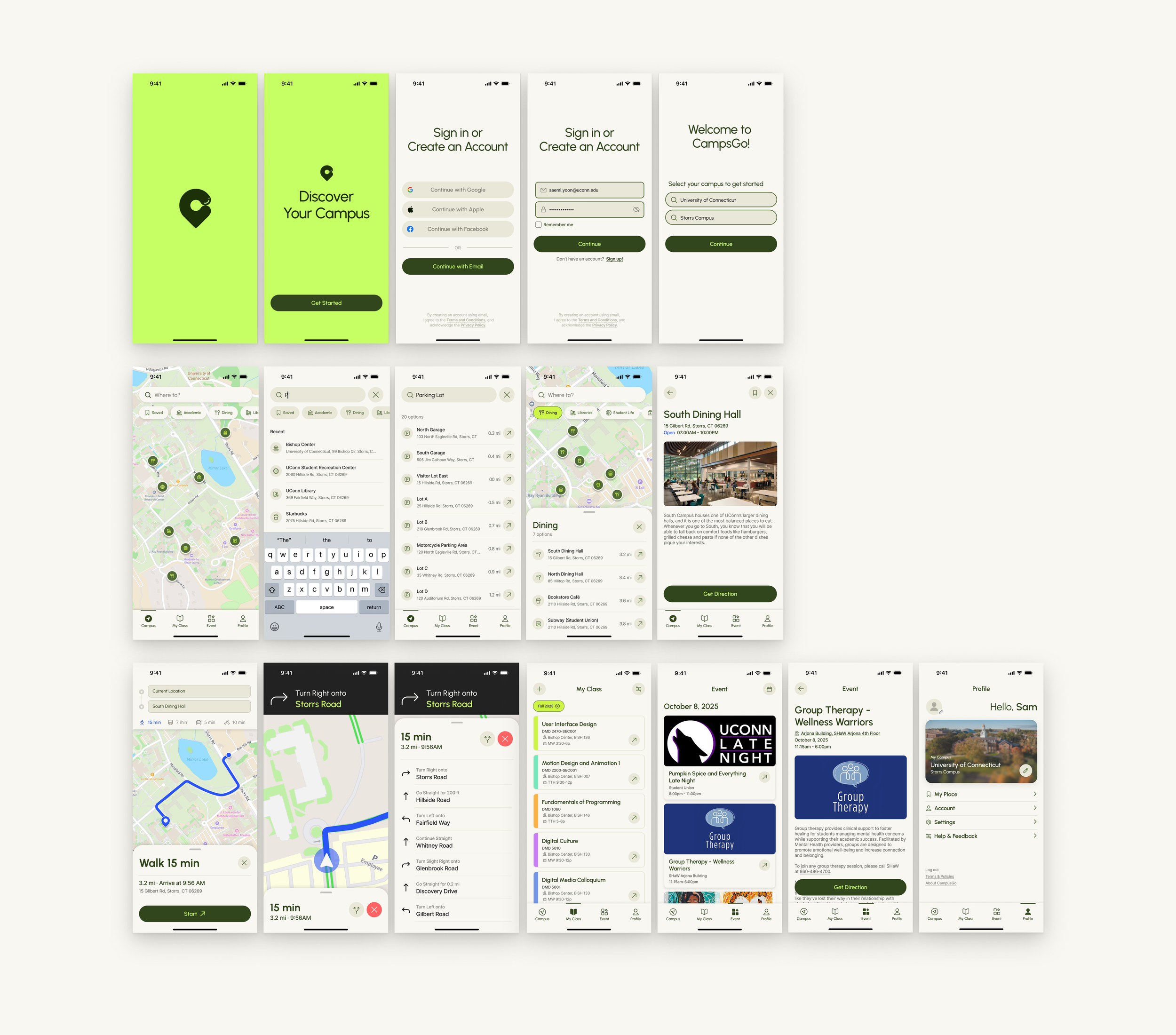 CampusGo is a campus navigation app that helps students easily find locations, classes, and events across campus. Designed as an integrated experience, the app simplifies wayfinding and access to essential campus information in one intuitive interface.