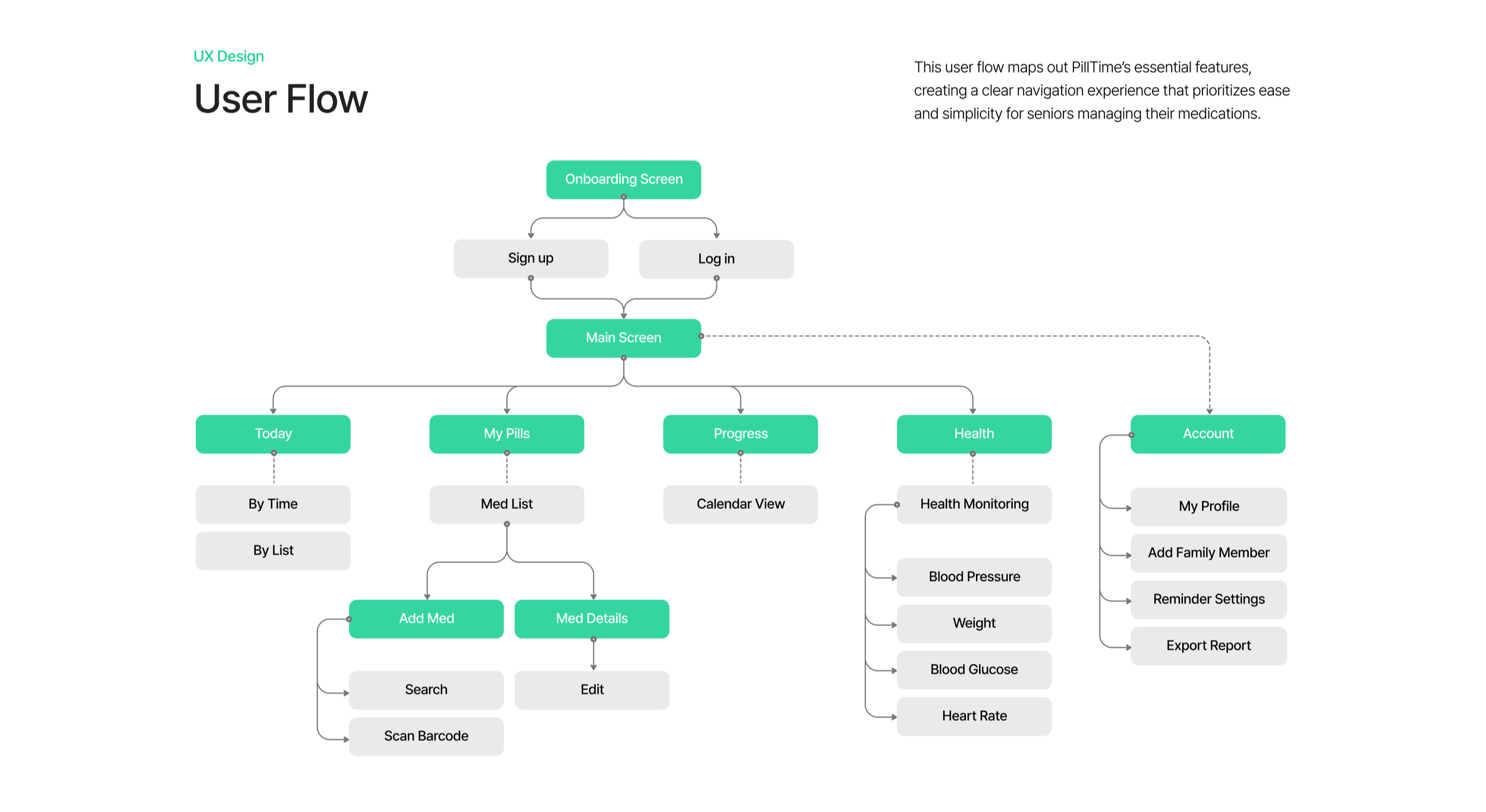 The app supports seniors in maintaining their medication routines with ease and confidence by prioritizing accessibility and age-friendly UX principles. Through clear visual hierarchy, straightforward interactions, and gentle reminder systems, Pilltime simplifies complex medication schedules and reduces cognitive load in daily health management.